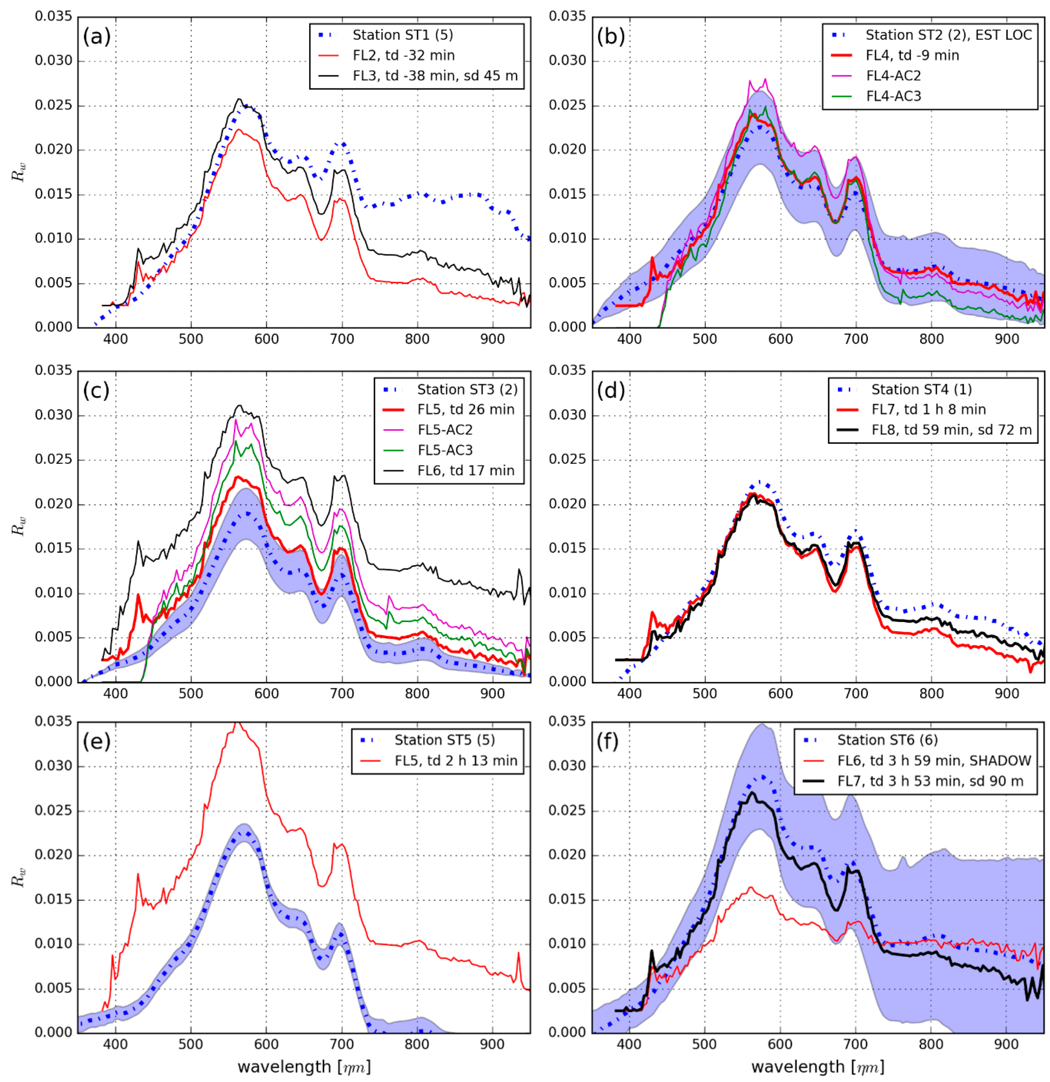(a–f) In situ station and image-derived Rw of each matchup. The best matchups in terms of Chi-square and spectral angle are shown in a thicker line in panels (b–d,f); Image Rw from atmospheric correction strategies AC2 and AC3 are included in panels (b,c); Bracketed values in the panel legends state the number of spectra used to calculate the in situ spectrum and error bars; td = time difference between in situ measurement and image acquisition, sd = distance between in situ and image matchup measurement, if applicable. Standard deviations for the in situ station measurements are plotted as error bars (blue shading) where available.
