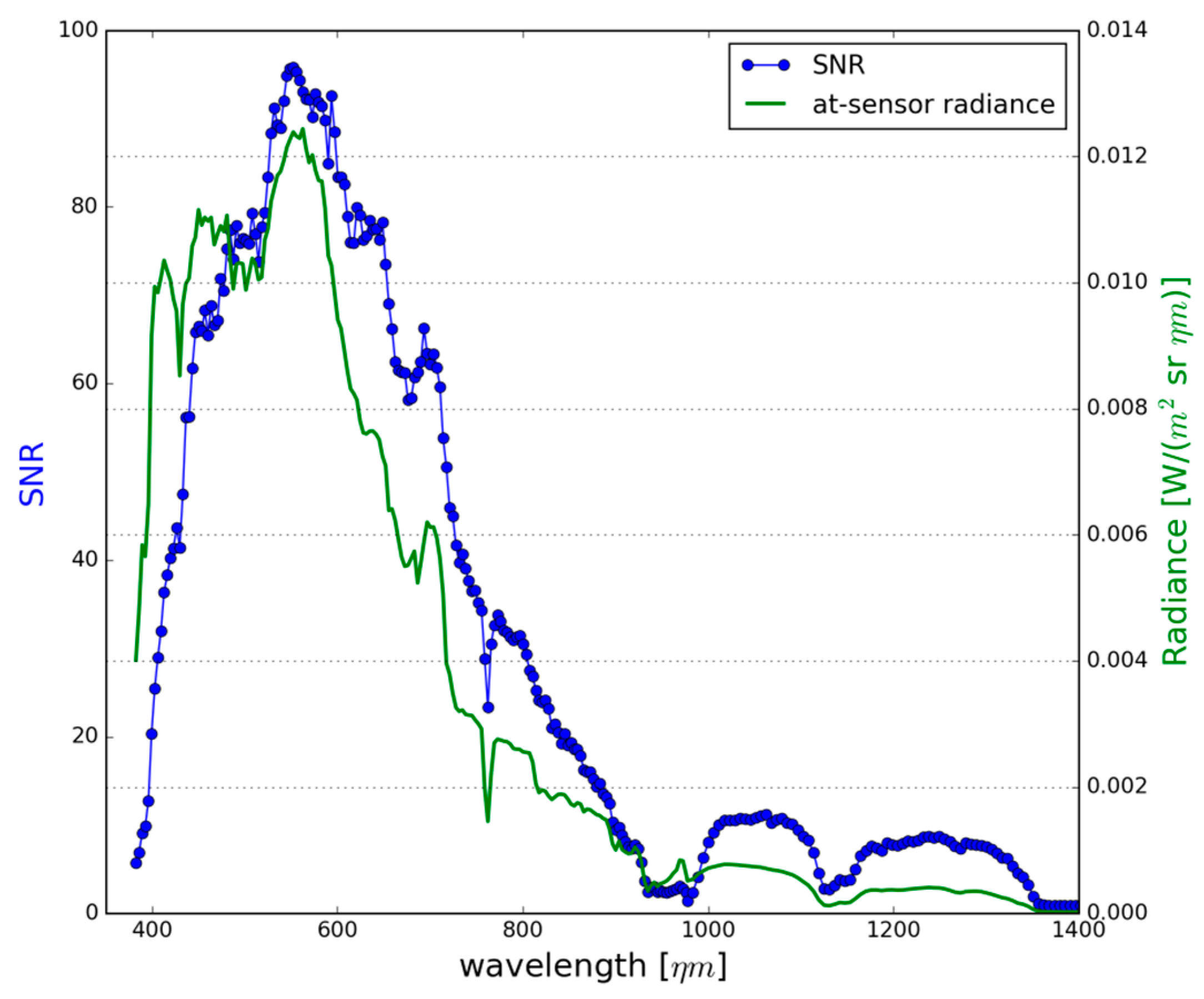 - Gao, B.-C. An operational method for estimating signal to noise ratios from data acquired with imaging spectrometers. Remote Sens. Environ. 1993, 43, 23–33. [Google Scholar] [CrossRef]