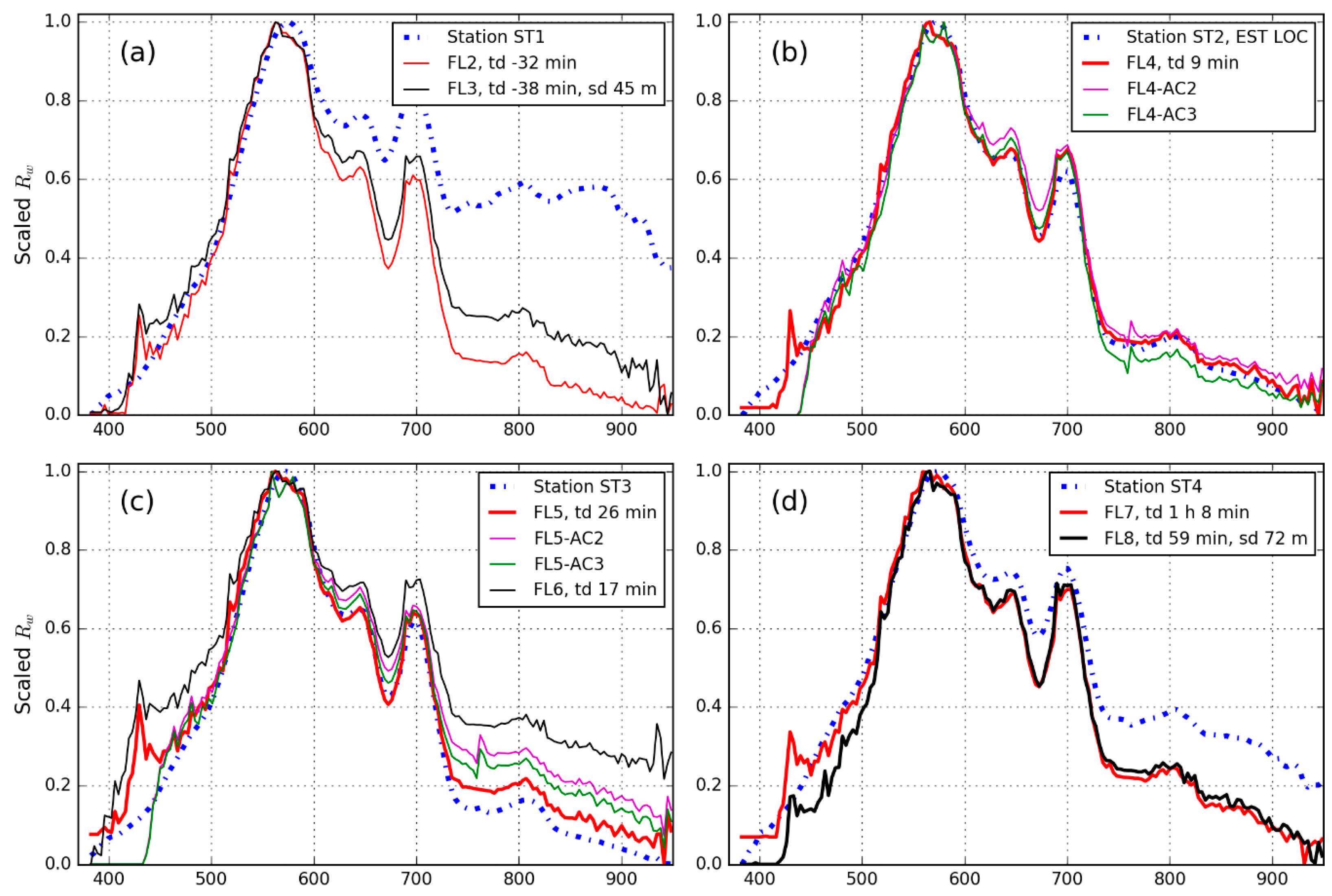 (a–f) In situ station and image-derived Rw spectra standardized between 0 and 1. Image spectra corresponding to the best five comparisons are plotted as thicker lines. Image-derived standardized Rw from atmospheric correction strategies AC2 and AC3 are included in panels (b,c). In panel legends, td = time difference between in situ measurement and image acquisition, and sd = distance between in situ and image measurement.
