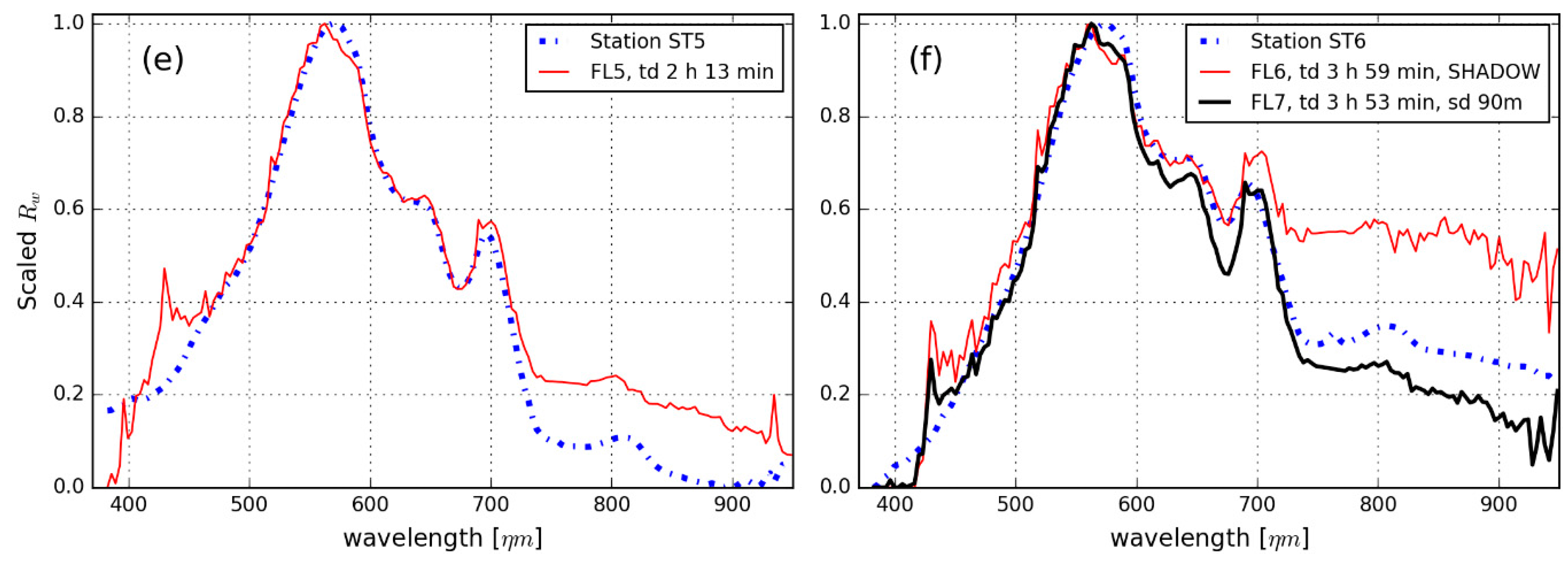 Matchup ST6-FL6 was disturbed by cloud shadow in image, and the magnitude of image-derived Rw deviated strongly from in situ Rw in the 450–750 nm wavelength range (Figure 4). When considering only spectral shape in the 450–750 nm wavelength range, the spectral angle value was 7.7°, comparable to other matchups. This is illustrated in the standardized spectra plotted in Figure 6f.