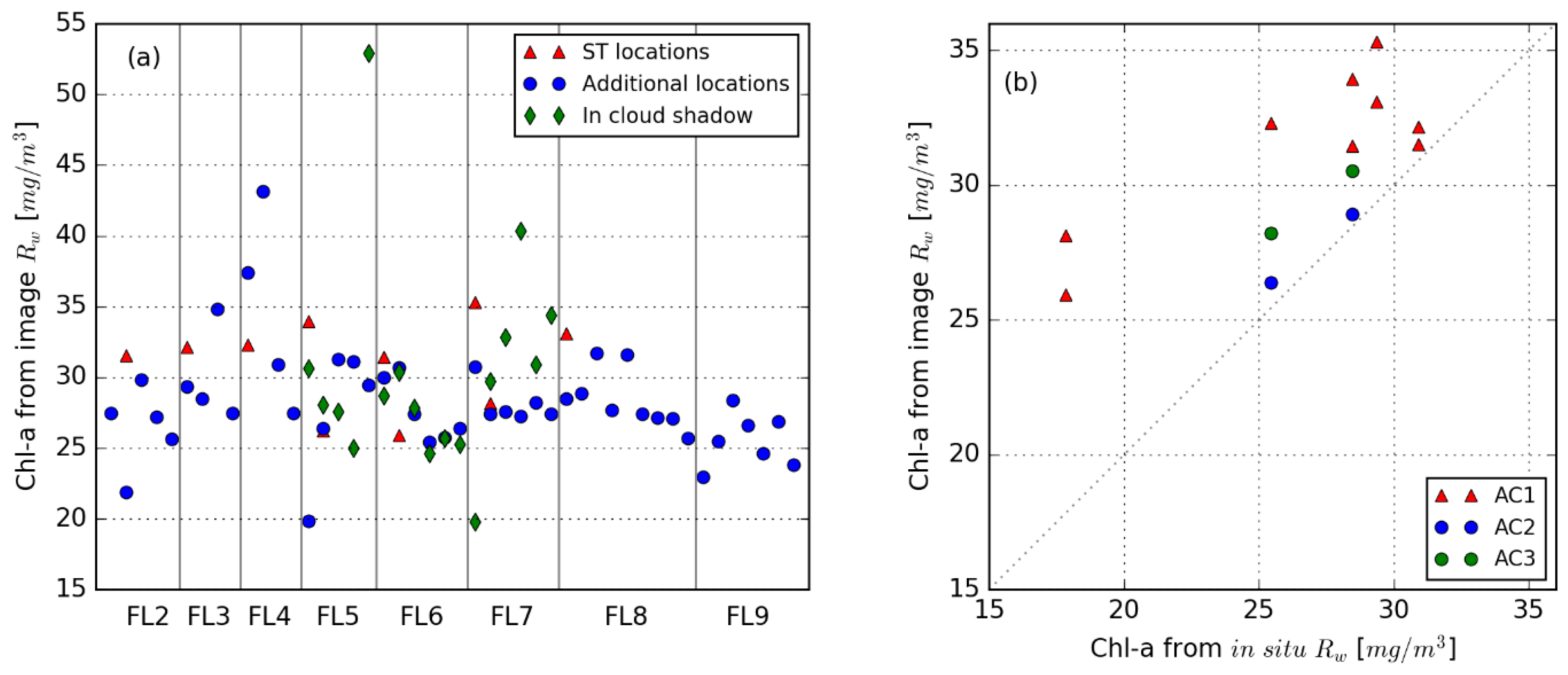 Chl-a concentrations were calculated from all measured image Rw spectra (Figure 8a), including locations under cloud shadow, and from all in situ station spectra, except ST5, as it included negative reflectance values. Chl-a concentration derived from in situ station spectra varied between 17.8 to 30.9 mg/m3 and was, on average, 24.9 mg/m3. Concentrations derived from the image spectra varied between 19.9–43.1 mg/m3, with an average of 28.7 mg/m3 and standard deviation of 3.8 mg/m3. When looking only at the station data, concentrations varied between 25.9 and 35.3 mg/m3 and the average was 31.0 mg/m3. Measurements located under cloud shadows produced concentrations between 19.8 and 52.9 mg/m3, with an average of 30.3 mg/m3 and standard deviation of 7.2 mg/m3.
