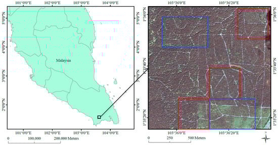 The study area of this research is located in the south of Malaysia, as shown in Figure 1. The manually interpreted samples used in this study were collected from two typical regions of our study area (denoted by the blue rectangles in Figure 1). To evaluate the performance of our proposed method, we selected another three representative regions in our study area (denoted by the red squares in Figure 1) and compared the detected images of these regions with the ground truth collected by manual interpretation.