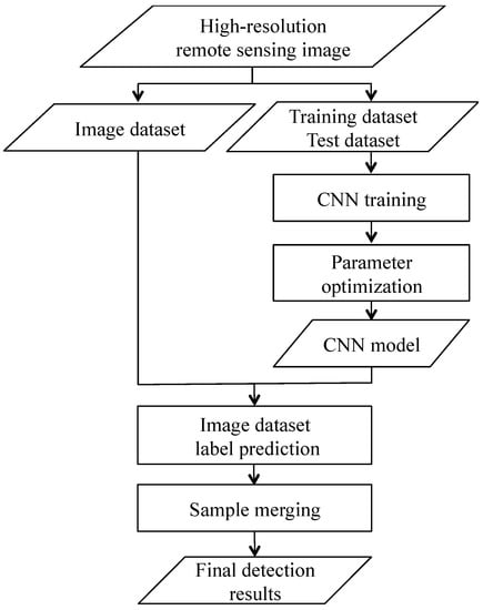 The flowchart of our proposed method is shown in Figure 2. First, the convolutional neural network [] was implemented based on the Tensorflow framework []. We used a number of training samples collected previously by manual interpretation to train the CNN, and calculated the classification accuracy based on a number of test samples collected independently of training samples. The main parameters of the CNN (e.g., the number of kernels in the first convolutional layer, the number of kernels in the second convolutional layer and the number of hidden units in the fully connected layer) were adjusted continuously until we found the best combination of parameters of which the overall accuracy was the highest on our test samples. By tuning the parameters, we achieved the best CNN model and saved it for further use. Secondly, the image dataset for palm tree detection was collected through the sliding window technique (the window size is 17 × 17 and the sliding step is three pixels). Then, we used the best CNN model obtained previously to predict the label for each sample in the image dataset. Thirdly, for all samples that were predicted as “palm tree” class, we merged the coordinates corresponding to the same palm tree sample (spatial distance less than a certain threshold) into one coordinate, and obtained the final palm tree detection results.