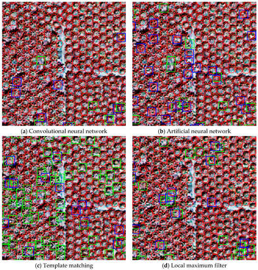 Table 2, Table 3 and Table 4 show the detection results of ANN, template matching (TMPL), and local maximum filter (LMF), respectively. Table 5 summarizes the performance of all four methods in terms of the number of correctly detected palm trees. Table 6 summarizes the performance of all four methods in terms of precision, recall and overall accuracy (OA). The proposed method (CNN) performs better than any of the other three methods in the number of correctly detected palm trees and in OA. Generally, machine learning based approaches (i.e., CNN and ANN) perform better than traditional tree crown detection methods (i.e., TMPL and LMF) in our study area, especially in region 1 and region 2. For example, the local maximum filter based method cannot detect palm trees correctly for regions where palm trees are very young and small (see Figure 7d), as the local maximum of each filter does not locate around the apex of young palm trees. The template matching method is not suitable for regions where the palm trees are very crowded and the canopies often overlap (see Figure 6c).