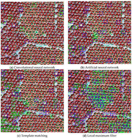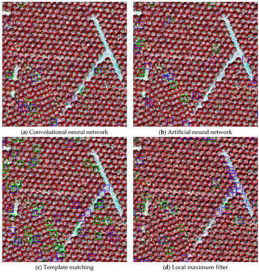Finally, the outputs of the template matching based method and the local maximum filter based method are post-processed (described in Section 3.4) to obtain the final palm tree detection results. Figure 6, Figure 7 and Figure 8 show the detection images of each method for extracted areas of regions 1, 2 and 3, respectively. Each red circle denotes a detected palm tree. Each green square denotes a palm tree in ground truth that cannot be detected correctly. Each blue square denotes a background sample that is detected as a palm tree by mistake.