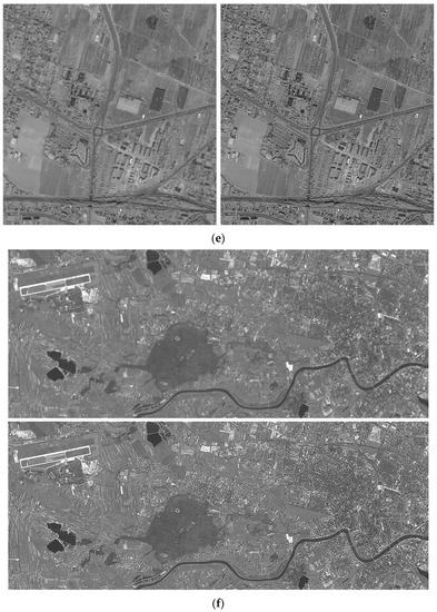 The general comparison of the source images (left/top) and the wavelet-enhanced images (right/bottom): Camera (a); Fourvière (b); Estate (c); Land (d); Suburb (e); City (f).