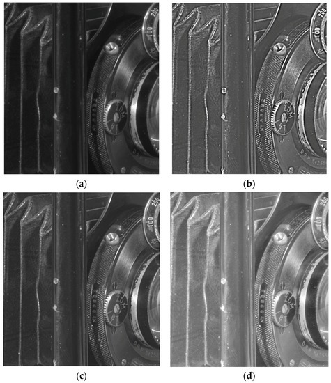 Figure 3 is an enlargement of a selected portion of the Camera image and makes it possible to compare the results of the WLCE with the results of the UM and the MSR methods. A visual comparison suggests that the proposed method, compared to the UM and MSR, enhances the contrast in a sustainable way and also better eliminates the influence of light. It is also worth mentioning that the WLCE, in comparison to UM, is more effective in the critical areas (small texts, details of the lens housing, including the porous ring). Also, the effect in the reduction of the influence of light is visible for the wavelet enhancement (the background is more uniform).