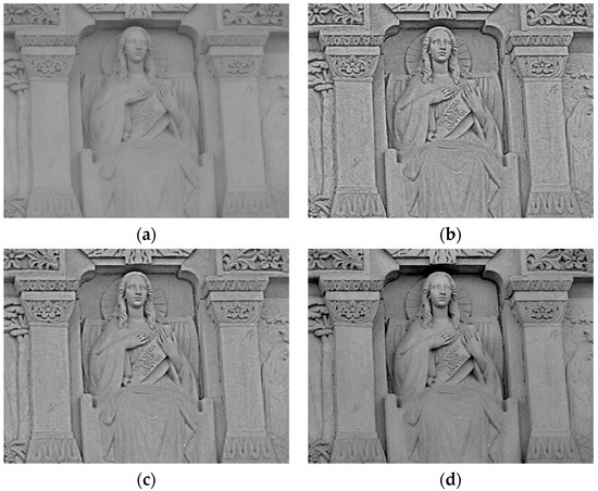 A visual assessment of the images compared in Figure 3, Figure 4, Figure 5 and Figure 6 shows a clear improvement of the edge discernibility for all methods, but the WLCE and MSR methods produce a stronger enhancement than UM. However, the MSR method does cause some luminance (Figure 6d—see the brightening of the sculpture’s forehead).