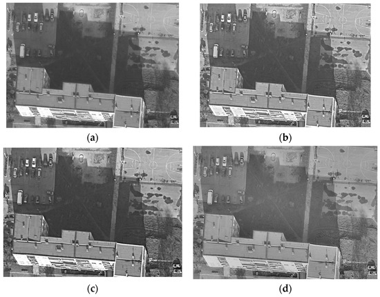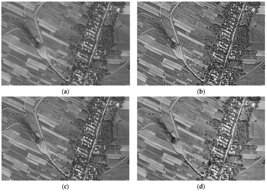 Prior to enhancing Camera (Figure 1a), it was established that the aim was to improve the visibility of the following minor parts: the barely visible text on the front of the camera, the soft texture of the leather box and the texture of the background (a fabric with a regular fine pattern). The aim of the enhancement of Fourvière (Figure 1b) was to improve the visibility of all the details across the image but especially in the bottom section. In the case of Estate (Figure 1c), the enhancement was focused on the edges in the shadowy area and in the over-exposed area (the building walls). The most important enhancement aim for Land (Figure 1d) was to improve the boundary visibility of the land parcels. In the case of Suburb (Figure 1e), the enhancement was focused on the improvement of vegetation visibility. The aim of the enhancement of City (Figure 1f) was to increase the visibility of linear spatial structures. For all tested images, it was also assumed that the easily visible elements should not be enhanced. Due to the very narrow histogram of DN, the source City image, and its UM enhancement were shown with histogram stretching applied. All other source images and all other enhanced images are presented without stretching. The WLCE and MSR methods use the full range of DN and this method can be called a quasi-stretching.