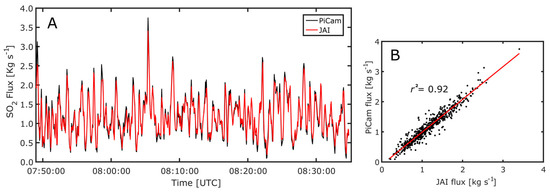 (A) Time synchronised SO2 fluxes calculated from the PiCam (black) and JAI (red) camera systems, between 07:49:00 and 08:35:08 UTC on 19 July 2016. The PiCam retrieved fluxes show excellent concordance with those of the JAI; (B) A scatter plot of contemporaneous fluxes, highlighting the remarkable correlation (r2 = 0.92).