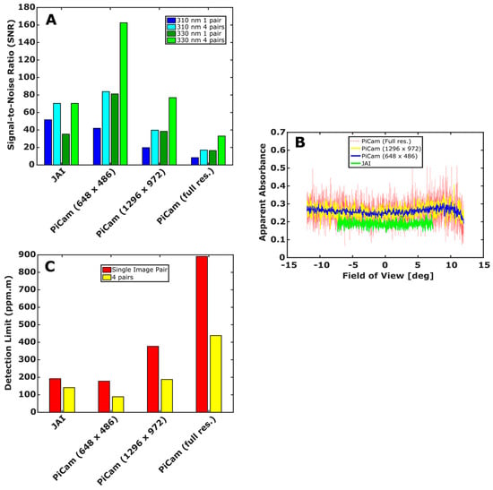 (A) Signal-to-noise ratios (SNRs); (B) Cross sections over apparent absorbance images for a SO2 cell (1861 ppm·m); (C) Detection limits for the JAI and PiCam systems with equivalent exposure times. For the PiCams, we examined both binned (648 × 486 and 1296 × 972) and full resolution (2592 × 1944) arrays. The former binning scenario provides approximately equal pixel resolutions across both systems (the JAI camera has a narrower FOV); the latter binning scenario provides approximately the same FOV per pixel from both systems. Four images were also co-added to increase SNR in (A,C) by summing four successive images on a pixel-by-pixel basis; results from this process are displayed as “4 pairs” entries. The drop in PiCam apparent absorbance at FOV > 10° is a manifestation of the gas cell holder entering the edge of the camera’s field of view and thus can be neglected. The 648 × 486 binning scenario, which we consider to provide sufficient spatial resolution for volcanic gas monitoring applications, provides comparable performance to the JAI cameras in these experiments. See main text for full details.