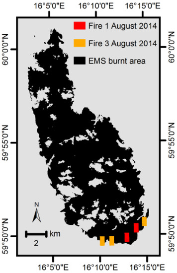 Test site Sweden 2014. Red and orange pixels show the detected AVHRR fire hotspots on 1 and 3 August 2014, respectively. Copernicus EMS burnt area mapping (black) is used as reference.
