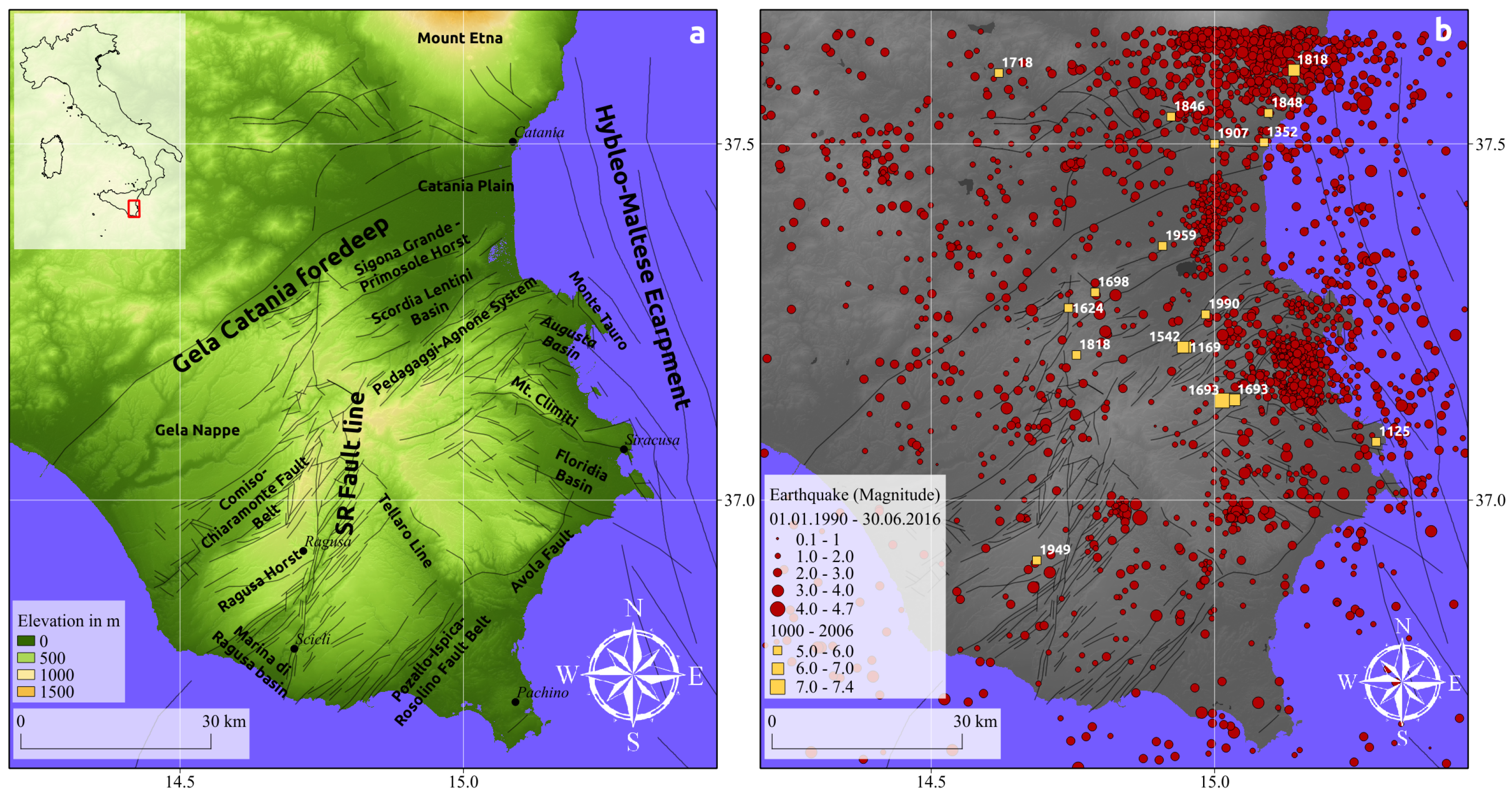 Historically, major destructive earthquakes hit the region in 1196, 1542 and 1693, though their location is still debated [23,73,74]. The last major earthquake (M = 5.4) occurred on 13 December 1990 located at the offshore part of the Lentini Graben [75,76]. The understanding of the neotectonics is of major interest for assessments regarding the regional seismic hazard. According to the national hazard maps it belongs to one of Italy’s most endangered regions with a 10% probability of exceeding a peak ground acceleration of more than 0.25 g within the next 50 years [77]. As shown in Figure 1b, there have been more than 450 small to medium strong earthquakes (M > 1) throughout the last 2 decades [66,78]. Despite numerous research activities it is still debated how the internal deformation of Sicily is accommodated by the faults and the number of faults that may take up this deformation [71].