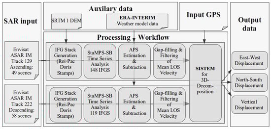 SISTEM simultaneously decomposes the input measurements into a 3-dimensional field vector based on the elasticity theory. The original SISTEM approach, as described by Guglielmino et al. [58], considers only one DInSAR dataset that is combined with the GPS data. The simultaneous integration of GPS and DInSAR measurements into a linear matrix equation is then solved by the WLS method. However, SISTEM can be easily extended by other DInSAR datasets as well as other geodetic measurements. Since the algorithm calculates every pixel singularly, SISTEM is capable of adapting the DInSAR-GPS integration according to the number of available DInSAR measurements for a particular pixel. In our case, conditioned by the expected small displacement rates, preference was given to the highest possible constrain of the WLS solution considering only overlapping pixels of both DInSAR datasets used.