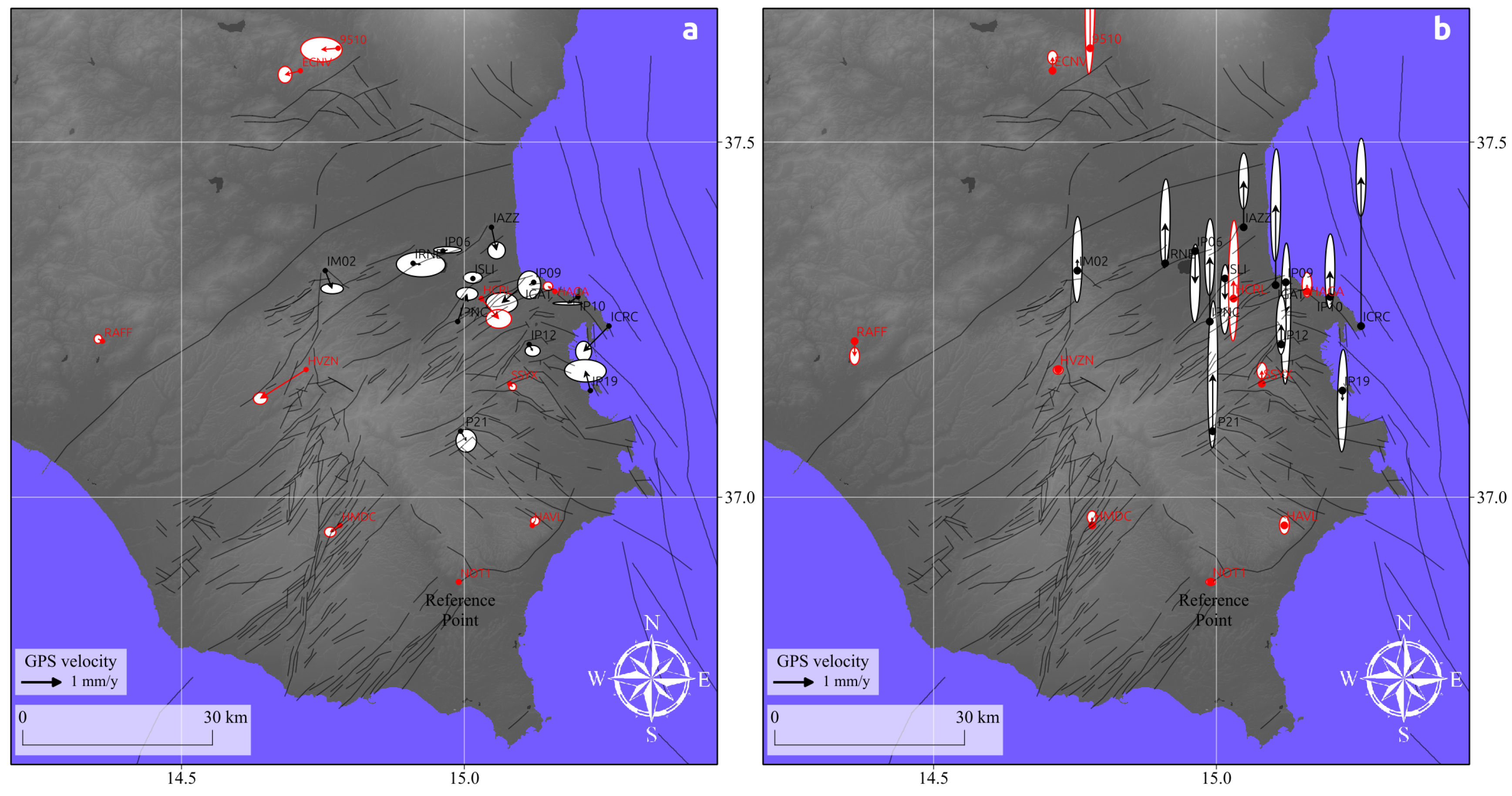 GPS velocity field: Horizontal (a) and vertical (b) velocities with respect to the NOTO reference station (NOTO). Black stations have been installed between 1993 and 1997, while red stations were installed after 2000. The velocity field was originally calculated by Angelica et al. 2013 [65]).