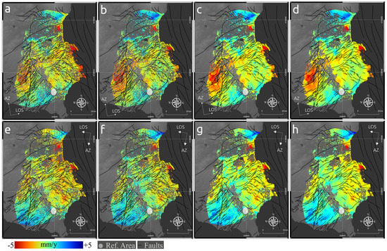 (a–h) Mean LOS velocities (upper row: ascending track; lower row: descending track): (a,e) corrected for orbital and DEM error; (b,f) tropospheric corrected datasets; (c,g) gap-filled dataset; (d,h) multi-directional Lee filtered dataset.
