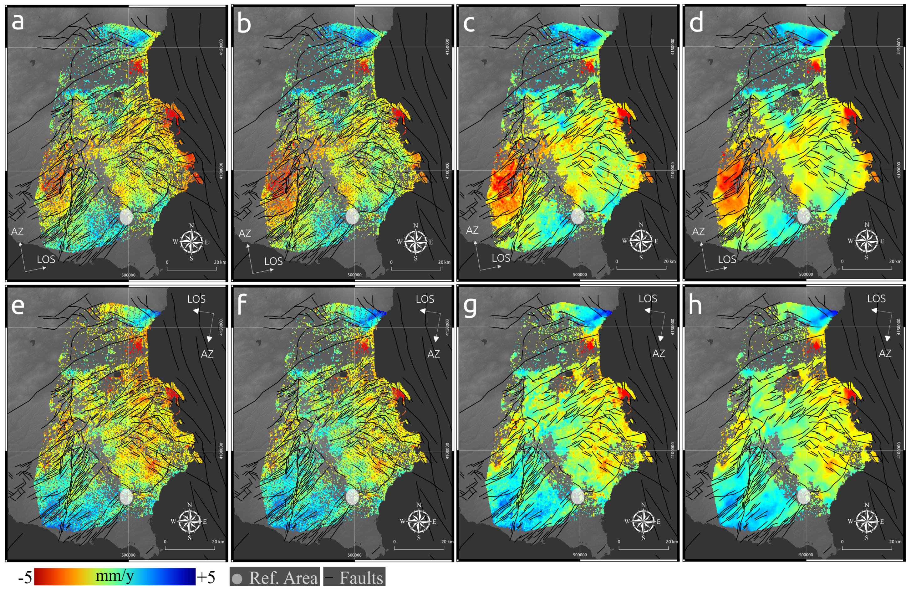 However, isolated pixels within such enclosed areas often suffer from increased phase noise so that in some of the gap filled areas a “salt and pepper” noise becomes apparent due to the higher weight in the interpolation process of those pixels. In order to smooth those areas, the multi-directional Lee filter was applied subsequently (Figure 4d,h). Since it is an anisotropic filtering approach, gradients along faults have not been affected as it would be the case for standard mean filters. By integrating the combined application of the gap-filling and anisotropic filtering in our workflow, it became possible to exploit the spatial correlation of the DInSAR data and enhance the coverage for the subsequent SISTEM data integration without introducing further noise. Indeed, the difference of the RMSE between the GPS velocities projected in the LOS and the tropospherically-corrected DInSAR LOS before and after this procedure amounts to 0.02.