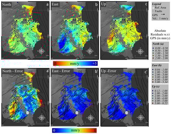 By integrating the GPS velocities (Figure 3) with the corrected and spatially enhanced mean LOS velocities (Figure 4d,h) into the SISTEM framework, the complementary features of both measurements are utilized to retrieve three-dimensional displacement estimates in the north-south, east-west and up-down direction (Figure 5a–c). The corresponding standard errors from the WLS solution are also provided as well (Figure 5a’–c’). In addition, the absolute residuals with respect to the original GPS data have been computed (Figure 5). However, this information should not be regarded as an independent validation source since the GPS data were used as an input into the decomposition. It rather indicates how the GPS measurements are affected by the integration with the DInSAR dataset. The standard error, instead, is biased by the fixed covariance values used for the WLS solution. The estimates are therefore unreliable in absolute terms, but can indicate relative errors that are related either to data input issues, or the circumstance that the surface is not deforming in an elastic manner. In order to realistically access the overall performance of SISTEM in terms of numerical accuracy, the retrieved velocity field has been used to recalculate the LOS velocities of the two SAR tracks. The residuals between the predicted LOS velocities from the SISTEM estimates and the original LOS (Figure 6) reveal a mean value of −0.45 mm/year with a standard deviation of 1.12 mm/year for the ascending, and a mean value of 0.76 mm/year with a standard deviation of 1.67 mm/year for the descending track. This result, in addition to the aforementioned deviations, ranging from 0.1 mm/year to 1.5 mm/year, between the GPS and the original LOS velocities into account, demonstrate the ability of this method to retrieve three-dimensional sub-centimeter surface deformation.