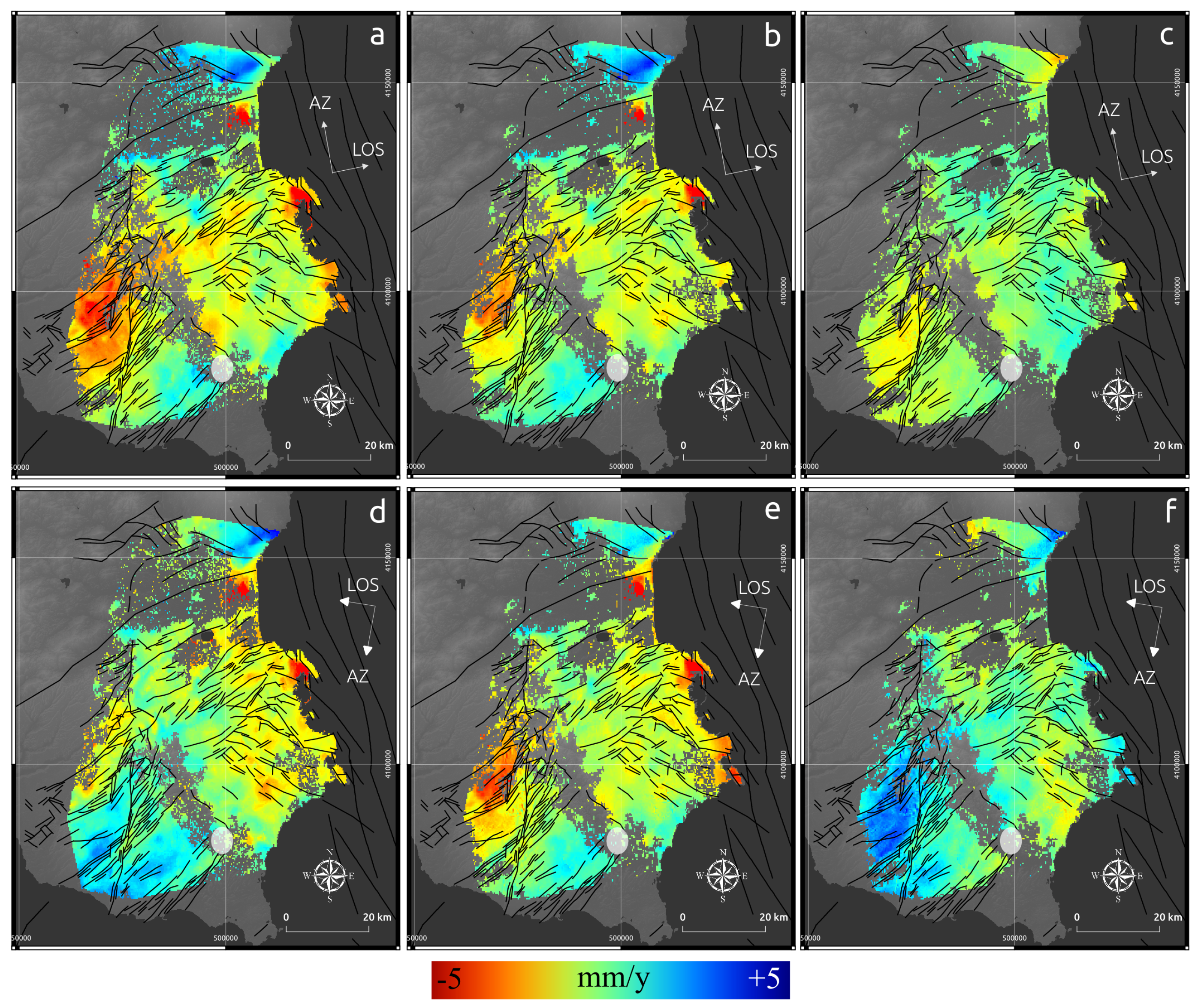The same rationale applies to the Avola fault and its secondary structures in the south-east of the study area. A westward movement of about 2–4 mm/year has been detected which is bounded along the fault. Due to the absence of GPS measurements on the eastern side of the fault, the quantitative and directional displacements might not reflect the actual deformation, but the fault location is obtained in an unprecedented spatial detail.