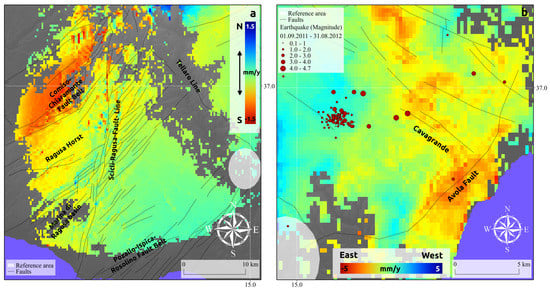 Zoom-in on the (a) north-south velocity field along the Scicli-Ragusa fault; and (b) the east-west velocity field of the area around the Avola fault with the overlay of the earthquakes associated with 2011/2012 seismic swarm event [69].