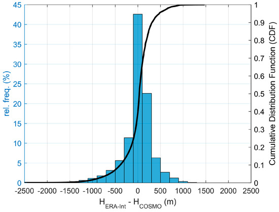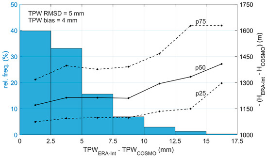 The comparison between ERA-Int TPW and COSMO reference TPW is shown in Figure 5 for grid points with altitude differences (COSMO minus ERA-Int) greater than 1000 m. Differences in TPW reach a maximum of 17.2 mm and present an average of 4 mm and root mean square difference (RMSD) of 5 mm. For each bin of the histogram (Figure 5), the median (black solid line), 25th, and 75th percentiles of height differences between ERA-Int and the reference COSMO indicate that the differences of height tend to be larger with the increase in the departures of ERA-Int TPW from reference.