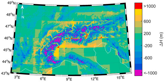 The LST algorithm that is currently being developed by the CM SAF makes use of ERA-Int water vapor and temperature profiles at 60 pressure levels with a horizontal resolution of 80 km [13]. The base altitude for these profiles is defined by a relatively coarse orographic field representative of the model spatial resolution. For mountainous regions, departures of ERA-Int height from actual topography can be very large, and in the Alps these differences can reach 2500 m in a reduced number of locations (Figure 2).