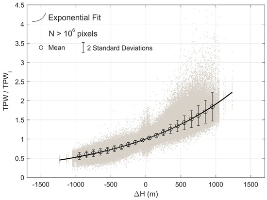 - The exponential parametrization of Total Column Water Vapor. Assuming hydrostatic equilibrium, which is a good approximation for the vertical dependence of the pressure field in the real atmosphere, TPW decreases exponentially with height, where the rate of decay depends on the temperature lapse rate. As such, we tested a parametrization based on the exponential decrease of TPW with altitude [32,33], i.e.,where and are the estimated and reference TPW, respectively. and are the high and coarse resolution altitude, respectively. The scale parameter α is estimated by linear regression using COSMO fields of height and TPW for all grid-points and for all data considered in this study. For each COSMO grid point and observation, we considered the values of height and of TPW over each grid point and the surrounding eight neighbors. Differences in H and ratios in TPW were then computed between surrounding neighbors and the central grid point (Figure 4). Taking into account COSMO spatial resolution of about 2 km, the rationale is that for the area delimited by the eight neighbors, changes in TPW are mainly driven by differences in topography, while the thermodynamic properties of the atmospheric profile are maintained. The value of parameter is then estimated by linear regression performed between differences in H and the natural logarithm of the ratios in TPW. The obtained estimate for parameter α was 1547 m, i.e., TPW decreased by a factor of e when surface elevation increased by 1547 m.