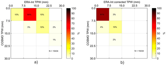 Contingency tables of the COSMO and ERA-Int TPW (in mm) for the April to September period (only cases with height differences between models greater than 1000 m are used) (a) uncorrected ERA-Int; (b) ERA-Int with exponential correction.