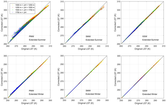 Scatterplots of corrected versus original values of retrieved LST for the four different classes of ΔH (yellow, red, green and blue dots) when PMW (left panels), SMW (middle panels), and GSW (right panels) retrieval algorithms are applied during extended summer (top panels) and extended winter (bottom panels).