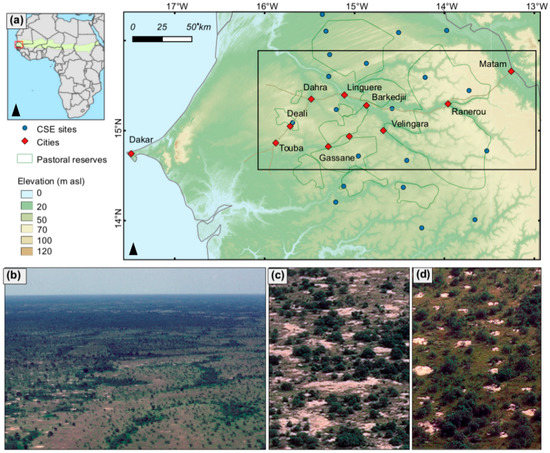 Changes in the Sahelian environment have been the focus of a plethora of ecological research since the major drought years of the 1980s [1,2,3]. The rich and diverse scientific literature, covering various temporal and spatial scales, often disagrees with the overall trends of environmental change [4] but recent research suggests the Sahel is an unstable but resilient ecosystem which is steadily recovering from prolonged droughts and below average rainfall conditions [5]. The potential of recovery is especially favoured in areas of low human pressure and population density [5], and after droughts in the 1980s had caused a serious reduction in woody cover [6], new studies have shown that the sparsely populated pastoral zones of eastern Senegal witnessed an increase in woody vegetation over the past decades [7]. This increase in woody plants seems to be followed by increased dominance of xeric plants [8,9] and causes declines in species diversity at the cost of ecosystem services (e.g., fruits and leaves for food and fodder, wood products for construction and medical purposes). Hiernaux et al. [10] showed that pioneer species (e.g., Leptadenia pyrotechnica, Guiera senegalensis or Calotropis procera) can rapidly populate these areas affected by drought-induced woody plant mortality. However, neither degradation nor recovery is spatially uniform, and several studies have shown the importance of soil type, soil permeability and available root depth as major factors influencing water availability and thus woody plant survival during drought and recovery [10,11,12]. Especially on shallow soils, soil degradation becomes a severe problem in the Senegalese Sahel if too many trees are lost, either by drought or human overuse [13,14]. Human management (e.g., cutting, burning, conservation laws, grazing pressure) also plays an important role in woody cover dynamics in the Sahel [6].