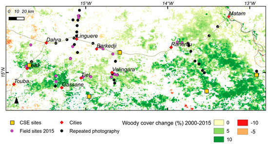 MODIS based woody cover changes (2000–2015) and location of the field sites. The area corresponds to the rectangle in Figure 1a. Insignificant (p > 0.05) trends are displayed in white, all colored trends are statistically significant (p < 0.05). CSE sites include species information and in situ woody cover for the period 1998–2015. Field sites 2015 provide information about species composition within greening areas in October 2015 and repeat photography portrays the vegetation in the years 1994 and 2015.