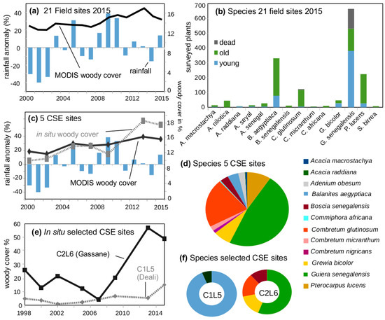 (a) Annual woody cover development with a strong increase until 2013 and a significant drop in 2014/2015 (21 field sites 2015, see Figure 2); (b) Species composition for the same sites in 2015 from a total of 1563 individuals of trees and shrubs; (c) Estimated (MODIS based) and in situ measured woody cover at 5 CSE sites (location shown in Figure 2) as well as rainfall anomalies; (d) Woody species composition surveyed in 2015 at the 5 CSE sites; (e) In situ woody cover 1998–2015 for two individual sites showing that the increase between 2007 and 2013 and the drop in 2014 is only present at the G. senegalensis dominated site C2L6, whereas the B. aegyptiaca stand C1L5 shows a subtle increase, even after 2014 (species data from 2015). The site C1L5 is illustrated in Figure 5 and C2L6 in Figure 6.