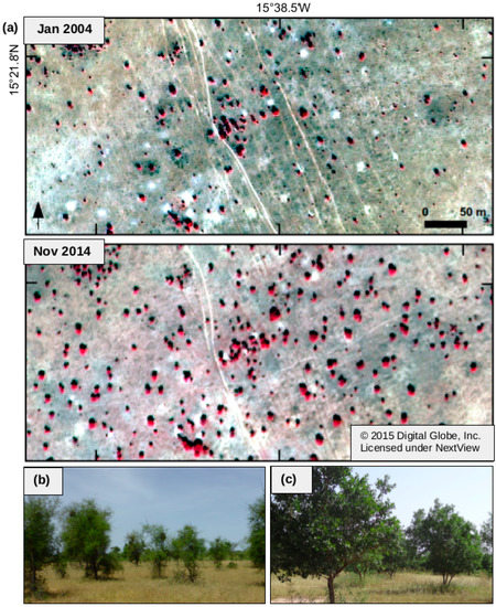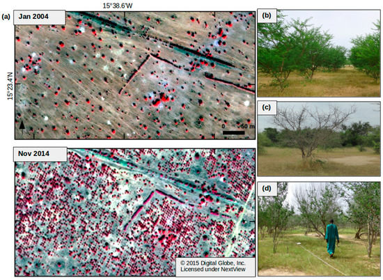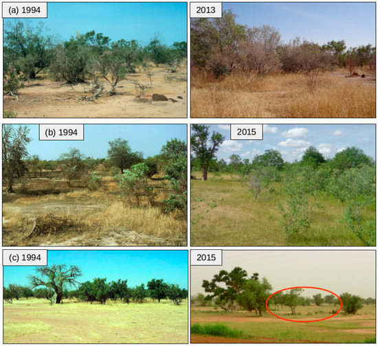 Repeat photography at 32 sites (location shown in Figure 2) show a generally stable woody cover between the 1983/1994 and 2013/2015 visits (Figure 7a,b). The main species observed in the photos are Balanites aegyptiaca, P. lucens, C. glutinosum and G. senegalensis and were consistent with the 2015 survey. Areas classified by EO time series as woody cover decrease were confirmed by the photo pairs. These areas are generally close to bigger cities, villages or main roads. Remaining stumps are evidence for tree removal (e.g., illustrated by the red oval in Figure 7c, photo taken close to the road to Barkedji–Linguère).