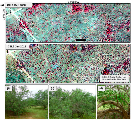 Since the 1980s, remote sensing has been a valuable tool to monitor both global and regional vegetation over long time scales at high temporal frequency [15,16]. However, due to the coarse resolution of the imagery (≥250 m), the distinction between the woody and herbaceous strata has been unattainable and vegetation trends have been interpreted as general changes in net primary productivity. Recently, several studies suggested a phenology based method to separate the signal of the woody and herbaceous plants [17,18,19]. The study by Brandt et al. [17] is calibrated by in situ woody cover data from Senegal, Niger and Mali and is able to quantify and monitor woody cover changes over the entire Sahel, suggesting large scale increases in the eastern parts of Senegal [17]. However, without detailed in situ observations from “woody greening” areas, it remains unclear what species and biophysical mechanisms are causing the observed patterns and trends. Moreover, long-term trends do not provide information on inter-annual dynamics in woody cover and how dry and wet periods affect the overall recruitment, growth and mortality of woody stratum. Ultimately, an improved understanding of the biophysical mechanisms driving woody vegetation dynamics is vital to addressing the resilience and robustness of dryland ecosystems in the context of climate change and natural resource management [20].