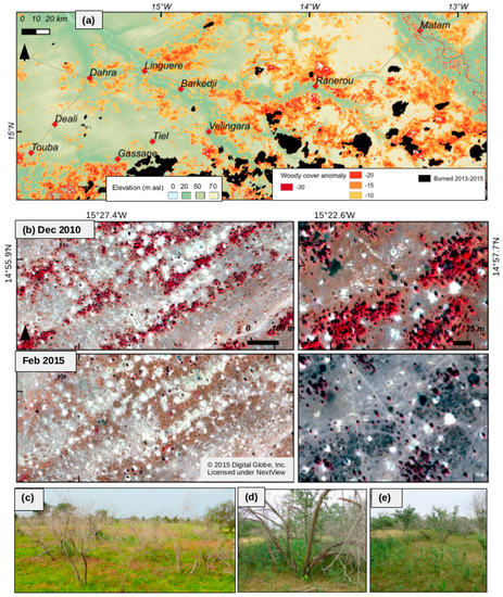 (a) Negative woody cover anomalies in 2014/2015. Burned areas 2013–2015 (detected by MODIS MCD45) are masked out in black. The anomalies are mainly concentrated in areas dominated by G. senegalensis in the east, whereas B. aegyptiaca dominated areas in the west are stable. Moreover, the morphology plays a decisive role and valley systems can mitigate the effects of low rainfall, as seen by the valley from Linguère to Ranerou or Barkedji, and farther south. Note that an NDVI anomaly does not necessarily imply the death of woody plants (b) Dense woody plants in inter-dune depressions close to Gassane in December 2010. The same stand shows only few living plants in February 2015 and a mass dying of shrubs. Photo (c) was taken within the same frame whereas (d) were taken on shallow soils close to Velingara. Photo (e) shows regeneration in the foreground with dead woody plants in the background. Field photos by M. Brandt October 2015.