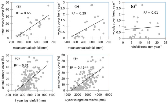 Relation between in situ woody cover at the CSE sites and rainfall comparing (a) mean woody cover and mean annual rainfall; (b) woody cover trends (2000-2015) and mean annual rainfall; (c) woody cover trends (2000–2015) and rainfall trends (2000-2015); (d) annual woody cover observations and rainfall with a 1 year lag and (e) annual woody cover and 6 year integrated rainfall.