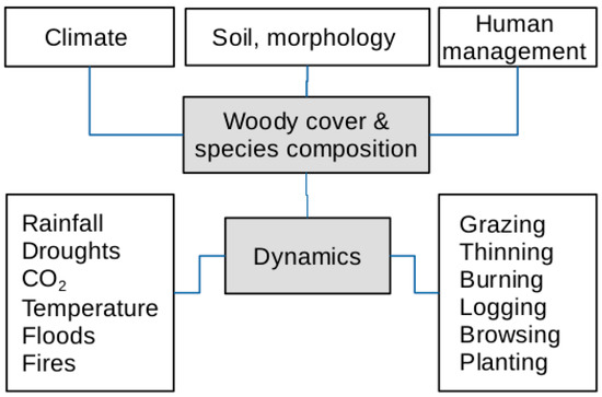 Links between long term (climate, soil and human management) and short term (climate events, human activities) drivers of dynamics in woody cover and species composition. Concept derived from Breman and Kessler [6].