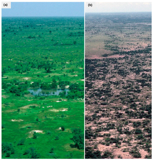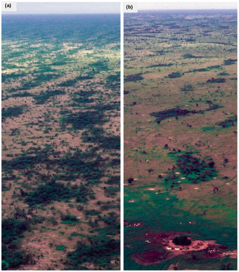 (a) A low altitude (150 m) view of the shrub and tree savannas of the southern part of the Sandy Pastoral Zone, 26 km east of Gassane, in the Ranch de Doli. It shows one of the thousands of natural seasonal ponds that fill each rainy season. While most of the woody cover looks green and productive, careful interpretation shows a high level of mortality among some of the small trees and shrubs (greyish in appearance). Field work in 1994–1995 confirmed these to be mainly Guiera senegalensis plants; (b) A view of a relatively homogeneous shrub savanna (or bushland) typical of the Ferrugineous Pastoral Zone. Pterocarpus lucens is the dominant small tree. The view shows the often abrupt boundary between the Ferrugineous Pastoral Zone and the Sandy Pastoral Zone. Location: 17 km NE of Linguère.