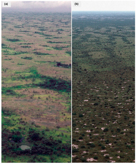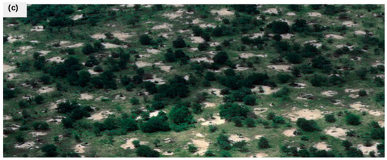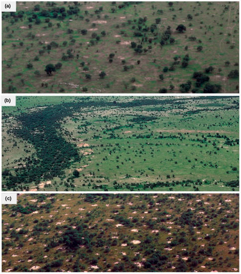 (a) This view captures the local diversity one finds within the Ferlo Valley, part of a fossil drainage system that dates back to more humid periods in the geologic past. Today, the stream flow is ephemeral, and serves to refill the numerous depressions with rain water, creating some of the most important wetlands for migrating birds in the entire Ferlo. The location of the view is from half way between Linguère and Barkedji; (b) This view is typical for some of the most open and degraded landscapes of the Sandy Pastoral Zone, where much of the woody vegetation has been logged for firewood and charcoal production. The grass cover remains continuous and relatively productive. Scattered old termite mounds (most of them no longer functional) are observed. The view is 18 km northeast of Deali; (c) A more detailed view of the structure of the morphology and vegetation cover of the Ferrugineous Pastoral Zone. The thin soils and centuries of termite activity have created a random pattern of bare areas–erosional remnants of once-functional termite mounds. This view is 26 km north of Barkedji.
