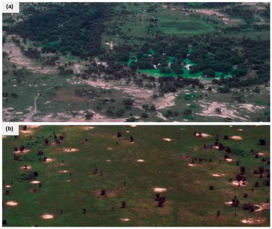 (a) A view of the more densely vegetated landscapes of the southern part of the Sandy Pastoral Zone, 42 km south-southwest of Linguère, in the Réserve Sylvo-Pastorale d’Oldou Debokol. The ancient longitudinal dune pattern is still clearly visible, with dense vegetation in the interdune depressions, and seasonal ponds that provide surface water to both wildlife and livestock; (b) Thousands of temporary ponds now occupy the depressions of this ancient erg of dunes. These depressions provide moisture for dense vegetation cover, forming a microclimate that represents a refuge of tree species from the Sudanian Zone, including Bombax costatum and Sterculia setigera. In the foreground, the small Fulani camp of Tambedu can be seen. Location: 19 km southwest of Linguère.