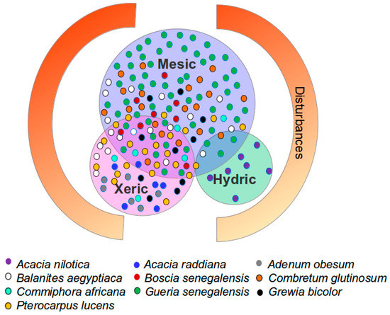 Distribution of woody species in the study area according to their habitat condition and disturbances (human and climate). The species density corresponds to Figure 3 (main text) and was normalized to 150. The size of the circles proportionally reflect the phytogeographic domains of the study area.