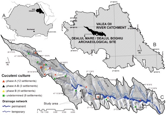 Figure 2A,B). The promontory is situated approximately 500 m south of the village of Filiași, on the right bank of the Valea Oilor/Recea brook (a left-bank tributary of Bahluieț River), part of the Prut catchment basin. The Valea Oilor brook forms a loop in this area, surrounding the promontory along three of its sides. The geographic coordinates are 47°15′07′′N and 27°02′27′′E. The absolute elevation is 185 m, and the relative one 85 m. The Valea Oilor basin is home to a high density of Eneolithic sites, 28 of which belong to the Cucuteni culture [