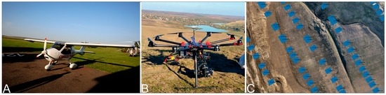 (A) Ultra-light aircraft used for the air surveys; (B) Octocopter with GPS module and gimbal hanging from the main platform; (C) The spatial distribution of the air photographs taken from the UAV.