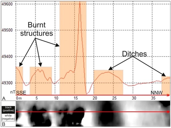 - David, A.; Linford, N.; Linford, P. Geophysical Survey in Archaeological Field Evaluation; English Heritage Publishing: Swindon, UK, 2008. [Google Scholar]