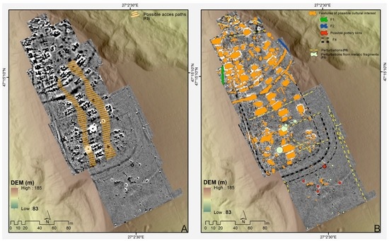 The final integrated interpretation: (A) Distribution within the study area of all anomalies identified using the array of techniques employed; (B) Distribution of anomalies regarded as belonging to the Eneolithic settlement.