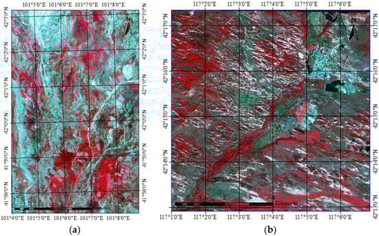 Figure 2. False color images of the study regions: (a) Geoeye-1 image, Ejina Banner, downstream of the Heihe River Basin, Inner Mongolia, China; (b) WorldView-2 image, Weichang county, Hebei Province, China. (False color composite: Red-Near infrared (for Geoeye-1 images)/Red-Near infrared 1 (for WorldView-2 images), Red and Green). - The WorldView-2 image acquired at 06:00 a.m. GMT (14:00 China Time, Beijing), 3 June 2014 (as shown in Figure 2b). The WorldView-2 satellite was launched on 6 October 2009 by Digitalglobe. The satellite provides 1 panchromatic band with spatial resolution of 0.5 m and 8 multispectral bands with spatial resolution of 1.8 m in 16.4 km swaths. The multispectral bands are: coastal (400–450 nm), blue (450–510 nm), green (510–580 nm), yellow (585–625 nm), red (630–690 nm), red edge (705–745 nm), near infra-red 1 (770–895 nm), near infra-red 2 (860–1040 nm).
