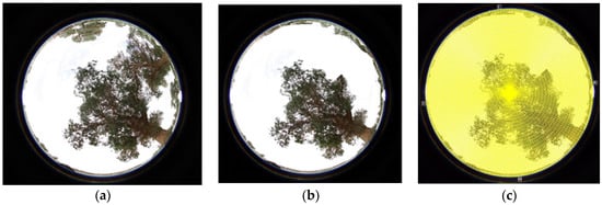 Typical hemispherical photograph from the experiment sites: (a) original; (b) modified to include only a single tree; (c) divided by sky map using Hemiview 2.1 software.