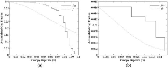 Figure 4 shows the change in after removing large gaps. The value of f is higher than that of fm for larger gap sizes (Figure 4a). After iteration, most gaps were removed, fr is similar to the new distribution, fmr, and the CI for a single tree can be derived. Twenty-eight hemispherical photos were processed across the two research regions, 14 in Ejina Banner and the balance in Weichang. Table 1 shows the derived and . The average CIs for P. euphratica Oliv. and B. platyphylla Suk. were 0.393 and 0.514, respectively.