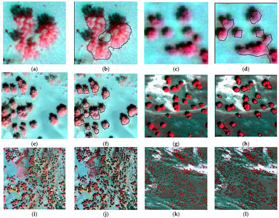 (a–l) Image segmentation and crown extraction with different edge lengths in false color. (a,b,e,f,i,j) Geoeye-1 image, plots of P. euphratica Oliv, located in Ejina Banner, Inner Mongolia, China. (c,d,g,h,k,l) WorldView-2 image, plots of B. platyphylla Suk., located in Weichang, Heibei Province, China. Plots with edge length (a–d) 30 m; (e,f) 100 m; (g,h) 125 m; (i–l) 500 m. (a,c,e,g,i,k) original multispectral images of the selected plots; (b,d,f,h,j,l) segmented tree crowns.