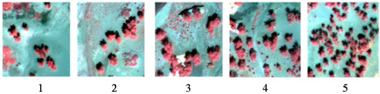 Figure 6 shows five typical samples in original images, with different numbers of trees and clumping indices (Figure 7). Thus, parameters such as the number of trees, LAI and background all affect the clumping index.